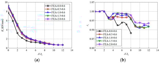 Figure 20 depicts the results of secant stiffness (Ki) and strength degradation ratio (λi). The specimen FEA-0.0-0.6 demonstrates the lowest value and highest degradation rate of stiffness compared to other specimens. It can be concluded that increasing the volume content of steel fibers reduces the amplitude and rate of stiffness and strength degradation, maintains the overall stiffness stability of the model, and enhances the seismic performance.