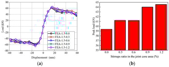 Figure 21 shows the comparison of skeleton curves and peak load of different stirrups ratios in the joint core area. The skeleton curves of all models basically overlap in the elastic stage. The stirrups ratio mainly affects the strengthening stage and failure stage of the skeleton curves. Without stirrups in the core area, the skeleton curve of FEA-1.5-0.0 declines after reaching the peak load, rendering the highest degradation rate. With the increase of stirrups ratio in the core area, the peak load increases (Figure 21b). Compared with specimen FEA-1.5-0.0, the peak load with stirrups ratio of 0.3%, 0.6%, 0.9%, and 1.2% in the core area increases by 3.1%, 3.0%, 7.8% and 8.7%, respectively. Noticeably, when the stirrups ratio increases from 0.6% to 0.9%, the increment of the peak load is the largest at 4.6%. As the stirrup ratio increases from 0.9% to 1.2%, the peak load of FEA-1.5-1.2 is only 0.8% higher than that of FEA-1.5-0.9. This indicates that the load-displacement properties are in a positive relationship with the stirrups ratio in the joint core area. However, the increment amount is not increased with the increase in stirrup ratio. The optimal enhancement effect occurs when the stirrups ratio is 0.9% in the present study.
