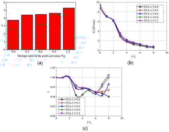 Influence of stirrups ratio on the (a) Displacement ductility coefficient, (b) Stiffness, and (c) Strength degradation.