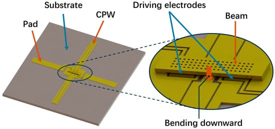 As shown in Figure 1, for the conventional electrostatic double-clamped switch, the driving electrodes are symmetrically located on each side of the double-clamped beam. When the voltage is applied to the driving electrodes in the on state, the electrostatic force is generated between the beam and the driving electrodes. Hence, the beam bends downward under electrostatic force until it reaches the driving voltage. Meanwhile, the beam contacts with the CPW and shifts the switch to the off state. As the flexible substrate bends upward, the gap between the beam and the substrate decreases, generating stress and deteriorating the performance.