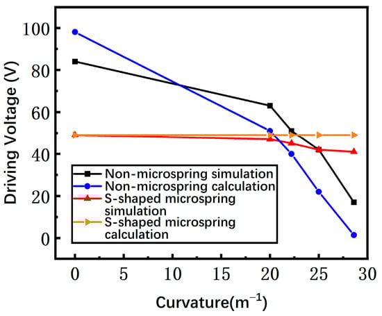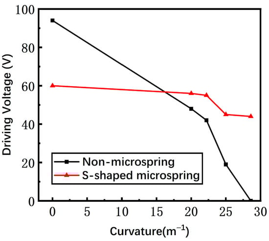 As the curvature rises, the stress of the switch is increased and the gap between the beam and the driving electrode is reduced. The driving voltage is related to the stress and the gap, and the overall effect on the driving voltage is decreasing. The simulated driving voltages of the switches with a non-microspring and an S-shaped microspring versus the curvature are shown in Figure 7. For a non-microspring switch, the driving voltage declines dramatically. However, the variation of the S-shaped microspring is relatively flat, demonstrating that the stress and the gap of the switch are nearly unchanged. Therefore, the S-shaped microspring and the island structure indeed efficiently reduce the stress caused by the substrate bending, which is consistent with the theoretical predictions.