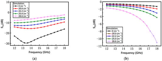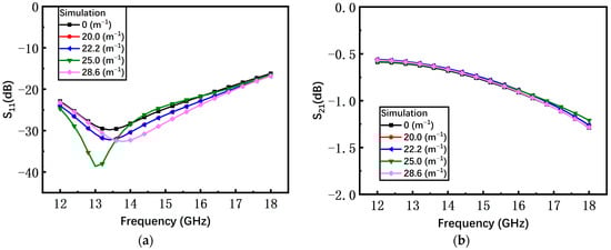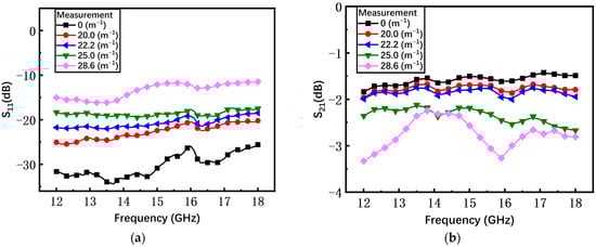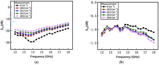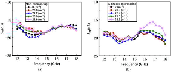 As shown in Figure 16a, with the increasing curvature, the average measured return loss S11 of the non-microspring switch has an obvious degradation from −30 dB to −13 dB. When the bending curvature is 28.6 m−1, the S11 increases by at least 13 dB compared to the initial state. The measured insertion loss S21 under different curvatures is shown in Figure 16b and the average S21 is degraded by 1.17 dB, from −1.58 dB to −2.75 dB.