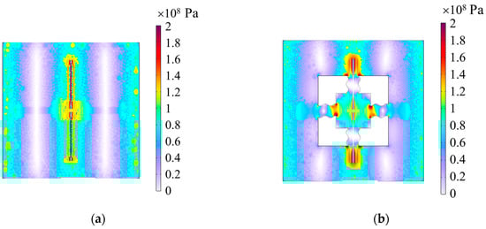 The simulated results of the stress distribution. (a) Non-microspring structure; (b) S-shaped microspring structure.