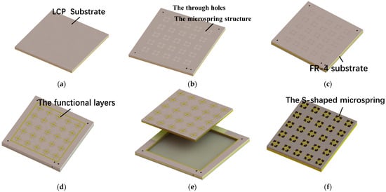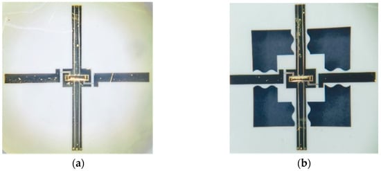 The fabrication process of the switch with an S-shaped microspring structure is shown in Figure 11. The microspring structures are firstly etched by laser and then bonded to a rigid substrate by temporary bonding to guarantee the substrate’s flatness [27]. After that, the CPW line is formed by traditional lithography, sputtering, plating, and etching. The photoresist is patterned on the CPW line to act as a sacrificial layer and could easily be removed in the following steps. Afterward, the 2 μm thick beam is fabricated on the organic sacrificial layer by optimizing the plating time, plating current density, and plating electrolyte to achieve a good elasticity modulus. Next, the substrate microspring structures could be formed by backside wetting etching. At last, the sample is debonded and the sacrificial layer is removed by wetting treatment combined with supercritical drying. Meanwhile, the profile of the beam is kept and the fabrication of the switch is finished. Optical images of the two types of switches are shown in the Figure 12.