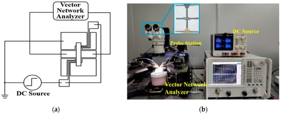 (a) The test circuit for the driving voltage and the microwave performance. (b) The measurement setup for testing the as-fabricated switches.