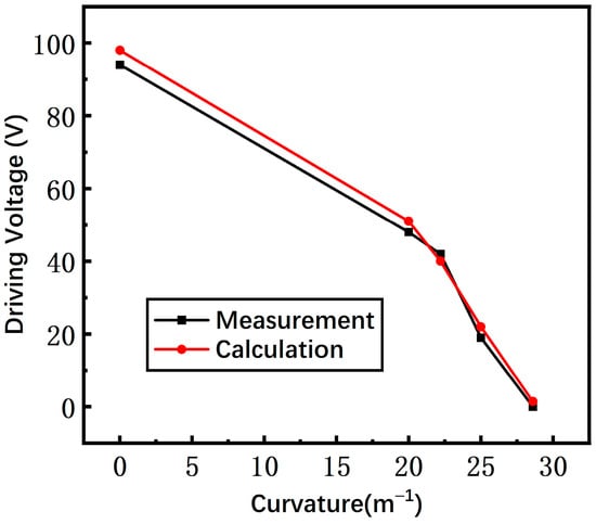 The different bending curvature frames of 0 m−1, 20.0 m−1, 22.2 m−1, 25.0 m−1, and 28.6 m−1 are designed to provide the test conditions. The driving voltage and S parameters are measured by an adjustable DC source (UNIT, Dongguan, China), a vector network analyzer (Keysight Technologies, Santa Rosa, CA, USA), and a probe station (Cascade Microtech, Beaverton, OR, USA) with two 150 µm pitch G/S/G probes.