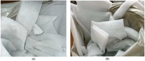 (a,b) Examples of the nonwoven fabric as a post-production waste of irregular shapes and dimensions from the production of upholstered furniture.