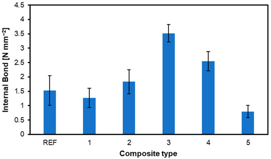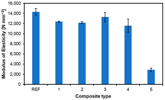 In the case of MOE (Figure 3), the reference sample achieved the best result without adding upholstery nonwoven fabric (14,308 N mm−2). The lowest MOE value again occurred for variant 5 (nonwoven content in the board), 2873 N mm−2, where the content of waste fabric was the highest. The only relationship when comparing the MOR and MOE results appears in the reference sample and the sample of variant 5, which have the highest and lowest results. However, analyzing the remaining variants with the addition of nonwoven layers, it can be concluded that variants 1–4 have very similar MOE scores (statistically homogeneous group). The MOE and MOR results, when compared to the standard requirements [30], show that the best-tested sample (composite type 3) reached the F 80 class (the top one, for above 120 N mm−2) for MOR and the highest class, E 140, for MOE (over 12,600 N mm−2). In light of this, composite 5, with the lowest parameters, achieves classes F 20 and E 30 for MOR and MOE, respectively. However, Bal and Bektas [31], comparing the properties of plywood made of poplar, eucalyptus, and beech, obtained increased flexibility after changing the plywood structure. These conclusions are consistent with the results of previous research by Biadała et al. [32].