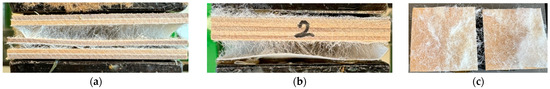 Examples of the destruction of the tested composites after the internal bond test: (a) plywood 1, (b) plywood 2, (c) the inner surface of the nonwoven fabric layer.