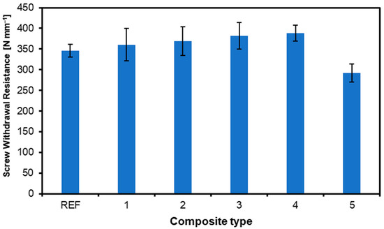The main connecting element for wood-based materials, such as plywood or OSB, is screws. Therefore, screw withdrawal resistance is one of the critical factors for wood-based materials used in construction [35]. Figure 6 shows the average screw withdrawal resistances. The average resistance obtained for the reference board is 346 N mm−2. This is neither the highest nor the lowest value obtained for the tested samples. The highest value was obtained for the sample of variant 4, which amounted to 388 N mm−2. In contrast, the lowest value was again obtained for the variant 5 sample and was 292 N mm−2. Some pictures of the samples during the SWR test are presented in Figure 7. The reference sample, which reached one of the lowest average values for SWR, was damaged by delamination of the face veneer. In the case of plywood 2 (Figure 7b), for which the SWR was higher than for the REF panels, the withdrawing screw broke the composite structure in the screw location zone. The lowest SWR average values were registered for plywood 5, presented in Figure 7c. It is shown that the sample damage occurred due to delamination in the core zone. This remark is in line with the observations of the IB tests, where panel no. 5 has the lowest IB values.