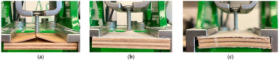 Examples of tested composites’ destruction after screw withdrawal resistance test: (a) plywood REF, (b) plywood 2, (c) plywood 5.
