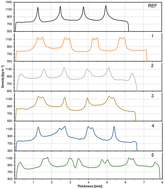 Figure 8 shows the density profiles of samples with layers of nonwoven upholstery fabric with a reference variant. The veneers showed a density of about 750–800 kg m−3, depending on the sample. The thickness and density of the nonwoven fabric were about 0.3 mm and 1100 kg m−3, respectively, and the reasons for that densification and thickness reduction were the binder impregnation and curing in the fabric structure during hot pressing. The bond line showed a bond density slightly above 1200 kg m−3 for the reference sample. The same result was obtained by Wronka and Kowaluk [8] in a study of upcycling wood dust from recycled particleboard as filler in lignocellulosic composite technology. A similar result was obtained by Daniłowska and Kowaluk [40] in an analysis of the use of coffee bean extraction residue as a filler in plywood technology. As for the samples reinforced with nonwoven upholstery fabric, all variants had a similar bond line density and were almost identical to the reference sample, which had a bond line density of about 1200 kg m−3. Differences in bond line densities within the same variant were also observed, which can be explained by excessively high viscosity during adhesive application, resulting in uneven bonding.