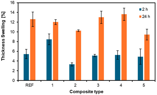 The results for thickness swelling and water absorption are shown in Figure 9 and Figure 10, respectively. After 24 h of soaking, the intensity of the thickness swelling was more pronounced in all samples than after 2 h. The lowest values after 2 h and 24 h were in the samples whose outer layers were nonwoven upholstery layers. This can only indicate the positive effect of the nonwoven fabric on the plywood and its reinforcing properties. After 2 h, the reference board had a swelling value of 5.4%; after 24 h, it was already 12.6%. The most significant difference in swelling per thickness after 2 and 24 h was in the variant 4 sample, which had nonwoven layers only inside the board. The swelling value after 2 h was 5.3%, and after 24 h, it was already 13.6%. The works of Buzo et al. [41] and Sugahara et al. [42] also found lower thickness swelling values for particleboards made of PU compared to ones made of formaldehyde-based resins.