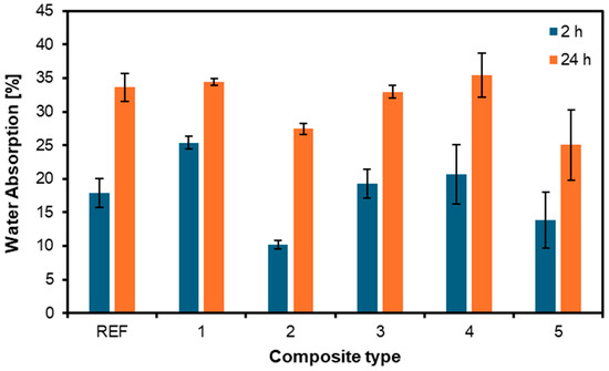 The results for the water absorption of the tested panels with different arrangements of nonwoven fabric layers are shown in Figure 10. The values achieved after 24 h are very close for all types of samples, even the reference one. On the other hand, the samples’ values after two hours are more diverse. The variant 2 sample obtained the lowest value, 10.2%, and its value after 24 h was 27.5%. In contrast, the variant 1 sample obtained the highest value after 2 h, 25.4%, and its value after 24 h was 34.4%.