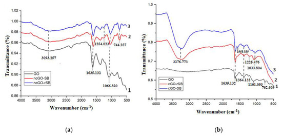 Figure 1. FTIR spectrum of (a) non-covalent conjugates (1—GO; 2—ncGO-SB; 3—ncGO-rSB); (b) covalent conjugates (1—GO; 2—cGO-SB; 3—cGO-rSB).