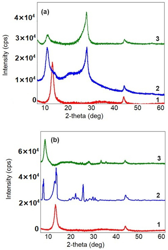 Figure 3. XRD patterns of (a) GO (1), ncGO-SB (2) and ncGO-rSB (3); (b) GO (1), cGO-SB (2); cGO-rSB (3).