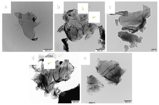 Figure 6. TEM images of (a) GO; (b) ncGO-SB; (c) ncGO-rSB; (d) cGO-SB; (e) cGO-rSB.