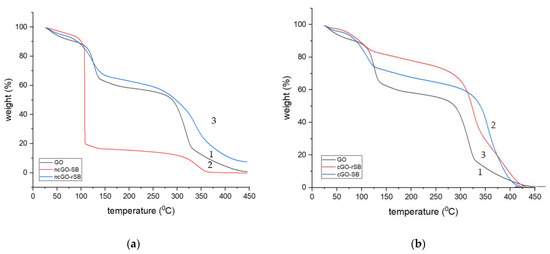 Figure 7. TGA curves of (a) non-covalent conjugates GO (1—GO; 2—ncGO-SB; 3—ncGO-rSB); (b) covalent conjugates GO (1—GO; 2—cGO-SB; 3—cGO-rSB).