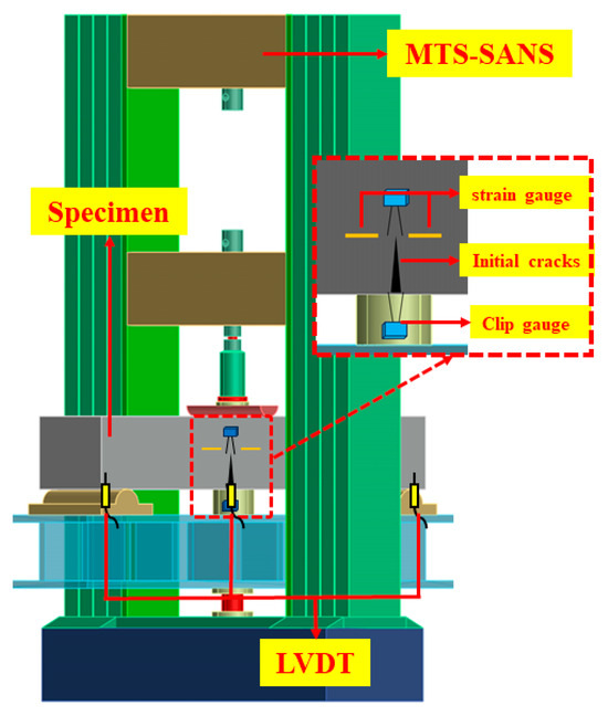 The loading setup for the fracture studies included three parts: an MTS-SANS (MTS Corporation, Eden Prairie, MN, USA) (30 kN) electronic universal testing system, a measuring system (i.e., clip gauges, strain gauges, and linear variable differential transformers (LVDTs)), and a computer system, as shown in Figure 5. Clip gauges with a maximum range of 50 mm were placed at the bottom and tip ends of the notch to measure the crack mouth opening displacement (CMOD) and crack tip opening displacement (CTOD) during the test. The LVDTs (50 mm) were arranged at the midspan and ends of the beam to obtain the deflection. Furthermore, four strain gauges were symmetrically attached to the pre-notched tip on both sides of the beam to determine the crack initiation (Figure 5).