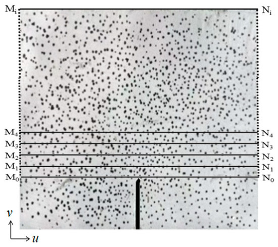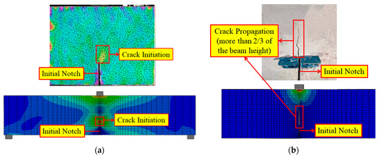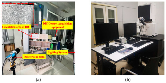 The digital image correlation (DIC) technique was adapted to measure the full-field surface displacement of the beam and obtain the crack propagation and characteristics such as the crack opening displacement (COD) and crack propagation length (ll). An area of 200 × 100 mm2 above the notch was prepared using the DIC technique (Figure 6a). Images of the specimen during the test were captured and analyzed using the DIC technique (aperture value of f/6.3, exposure time of 1/13 s, and image acquisition frequency of 0.5 Hz). It should be noted that the specimen was positioned perpendicularly to the industrial camera to reduce errors.