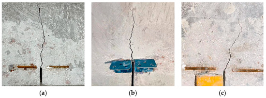 The specimens were fabricated as follows. First, the concrete mixture was filled into a test mold and vibrated uniformly. Second, prefabricated cracks were obtained by carefully removing the prebuilt steel plates (3 mm thickness) after the initial setting of the concrete (3 h). Third, the mold was removed after 24 h, and the specimens were cured under standard conditions for 28 d (temperature: 23 ± 2 °C, humidity: 95 ± 3%). The actual beam specimens are shown in Figure 4.