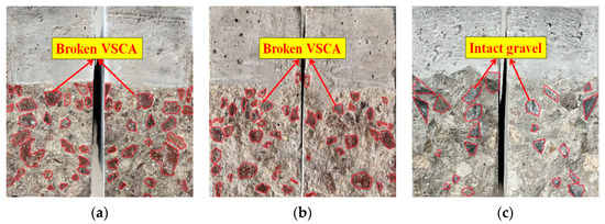 The typical fracture surfaces of the beams are shown in Figure 8. Compared to OC, the aggregates of VSAC and SVSAC were almost damaged, and their fracture surfaces were smooth, irrespective of a0/h (Figure 8). This can be attributed to the cracks that can easily cross the porous and lightweight VSCA. SS and SW had negligible effects on the fracture surface, and the failure pattern of VSAC was similar to that of SVSAC.