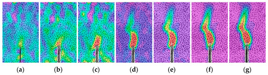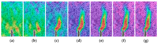 Strain distribution evolution of OC-0.3 during the loading period: (a) Pre-80%; (b) Pmax; (c) Post-80%; (d) Post-60%; (e) Post-50%; (f) Post-30%; (g) Post-15%.