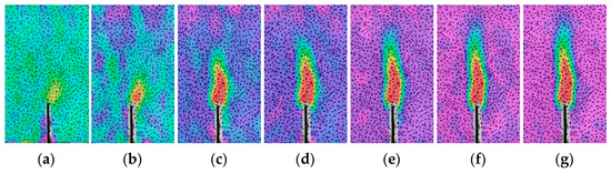 Strain distribution evolution of VSAC-0.3 during the loading period: (a) Pre-80%; (b) Pmax; (c) Post-80%; (d) Post-60%; (e) Post-50%; (f) Post-30%; (g) Post-15%.