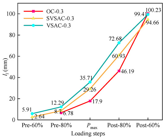 DIC accurately captured the development of ll and COD during the fracture failure process (Figure 12). It can be observed that ll evidently changes with variations in the concrete mix components. When P reached 60% of Pmax, the ll values of SVSAC-0.3 and VSAC-0.3 were 2.64 mm and 5.91 mm, respectively, while the ll of OC-0.3 was negligible. The cracks in the specimen appeared earlier after adopting volcanic scoria, owing to the lightweight and porous structure of VSCA.