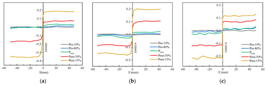 The crack propagation during the fracture process of the concrete specimens in this study was recorded using the DIC technique (Figure 9, Figure 10 and Figure 11). The displacement jump map obtained by DIC was also adopted to reveal the development of crack characteristics (COD and ll) (Figure 12, Figure 13 and Figure 14). The calculation method is described in Refs. [39,40]. The crack characteristics were negligible during the early loading stage.