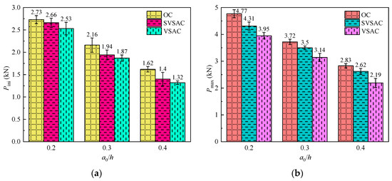 The Pmax of SVSAC decreases with increasing a0/h (Table 4, Figure 16b). The Pmax of SVSAC-0.2 was 23.14% and 64.50% higher than those of SVSAC-0.3 and SVSAC-0.4, respectively. Furthermore, Pmax changed with variations in the concrete mix components. It was found that the Pmax of the VSCA specimen decreased by 9.47% on average compared with that of OC; however, the Cl− in SW and SS can hydrate with cement and improve the microstructure of concrete, causing the Pmax of SVSAC to be 13.47% greater than that of VSAC.