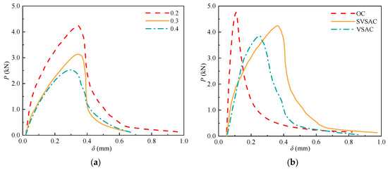 The failure of the SVSAC three-point bending beam was similar to that of the OC and VSAC specimens. The initial cracking of the beam first appeared at the tip of the notch when the vertical load (P) reached approximately 60–70% of peak load (Pmax). The number of cracks increased with increasing P. The cracks propagated approximately parallel to the loading direction (Figure 7). Deformation and cracks in the beam became evident when P approached Pmax. After the peak point, P decreased rapidly, and cracks crossed the entire section of the beam. The specimens failed suddenly.
