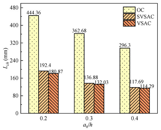 - The fracture characteristic loads (i.e., Pini and Pmax), Gf, and Lch of the SVSAC specimen decreased with increasing a0/h, and VSCA enhanced these effects. The Pini (Pmax) of specimens adopting VSCA was 10.94% (9.47%) inferior to that of the OC specimen, and this difference became small (4%) after using SW and SS. The fracture energies of the SVSAC and VSAC specimens were significantly decreased. Generally, the Lch value of SVSAC was, on average, 59.49% lower than that of OC.