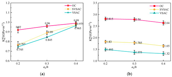 The Pini of SVSAC generally decreased with increasing notch-to-depth ratio (Figure 16a). It was obtained that the Pini of SVSAC-0.2 was 36% and 90% higher than those of SVSAC-0.3 and SVSAC-0.4, respectively. The SW, SS, and VSCA changed the influence of a0/h on Pini. Compared to SVSAC, the Pini of VSAC-0.2 was 36.29% and 91.67% greater than those of VSAC-0.3 and VSAC-0.4, respectively, and the effect of a0/h on Pini was reduced.