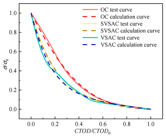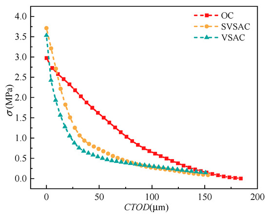 - The P-CTOD and σ-CTOD curves of SVSAC were characterized by rapid decline. The effect of a0/h on fracture toughness was minor, while the and of SVSAC decreased by 8.55% and 36.17% in comparison with those of OC, respectively. The tensile stress transmitted by the cracking surface of specimens adopting VSCA was significantly inferior to OC under a similar crack width, and this difference can be partly improved through using SW and SS in the early stage of loading. The improvements of SW and SS on the cracking and σ transmission of SVSAC became negligible when CTOD reached 0.1 mm.