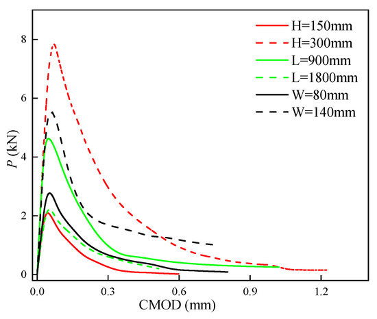 The characteristics of the P-CMOD curves of SVSAC also changed with a variation in the size of the specimen (Figure 31). It was obtained that the descending portion of the curve became steep after increasing H and decreasing L, which caused inferior deformability and unstable fracture toughness () of SVSAC. Furthermore, the critical CMOD (CMODc) was also improved through enhancing the size of the specimen. Generally, the CMODc of specimens with 300 mm H was 35.9% greater compared with that of specimens with 150 mm H.