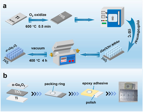 (a) Flow chart of TiO2–α-Ga2O3 preparation. (b) Schematic diagram of encapsulation procedure.