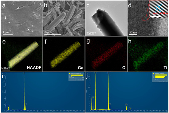 Crystal structure properties of TiO2/TiO2–α-Ga2O3 NRs. (a) Top-view SEM image of TiO2. (b–d) SEM/TEM images of TiO2–α-Ga2O3 composites at different magnifications. (e–h) HADDF of TiO2–α-Ga2O3 and mapping of corresponding elements (Ga, O, and Ti). (i) EDS spectra of TiO2. (j) EDS spectra of TiO2–α-Ga2O3.