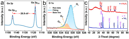 To further investigate the structural characteristics of TiO2–α-Ga2O3, Figure 3a reveals the core-level spectrum of Ga 2p, featuring two peaks at 1143.9 eV and 1117.0 eV, which correspond to the binding energies of Ga 2p1/2 and Ga 2p3/2, respectively. The peak separation is approximately 26.9 eV and the intensity ratio is 1:2. Ni et al. synthesized N-doped α-Ga2O3@C@G composites as an anode for lithium-ion batteries, in which the binding energies of Ga 2p1/2 and Ga 2p3/2 are 1145.7 eV and 1118.8 eV, respectively. This is in good agreement with our results [43]. For the O 1s core-level spectrum (as shown in Figure 3b), three peaks can be observed: 530.6 eV (OL), 532.0 eV (OV), and 533.3 eV (OA). The OL peak signifies lattice oxygen, corresponding to the overlapping contributions of O-Ga and O-Ti bonds in TiO2–α-Ga2O3 [44,45]. The OV peak represents vacancy oxygen, indicating a high density of oxygen vacancies in TiO2–α-Ga2O3. The OA peak corresponds to the adsorbed oxygen, suggesting chemisorbed oxygen on the α-Ga2O3 surface, which is mainly attributed to the presence of organic compounds associated with amorphous carbon [46,47]. XRD spectra of TiO2 and TiO2–α-Ga2O3 are provided in Figure 3c. An oxide layer is formed on the Ti substrate at 600 °C. Diffraction peaks at 35.9°, 62.8°, and 82.1° correspond to the (101), (002), and (321) planes of TiO2 (JADE#21-1276), respectively, matching well with the rutile phase TiO2. Six distinct 2θ peaks at 33.7°, 35.9°, 50.2°, 55.0°, 63.2°, and 65.0° correspond to the (104), (110), (024), (116), (214), and (300) planes of α-Ga2O3 (JADE#43-1013), respectively, demonstrating the smooth growth of α-Ga2O3 via hydrothermal and annealing methods. Notably, the peak corresponding to the (104) plane is the most intense, suggesting preferential growth of α-Ga2O3 along this direction [48]. He et al. reported the synthesis of α-Ga2O3/Cu2O p-n junction and its self-powered feature. The XRD peaks of this heterostructure at 36.0° and 64.7° correspond to the (110) and (300) crystal planes of α-Ga2O3, respectively, which are in good agreement with our work [49].
