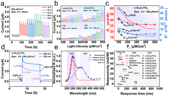 To further characterize the sensitivity of PDs, the response and recovery properties of self-powered PEC-PDs need to be investigated [54]. The rise and decay times (τr/τd) are determined by measuring the time required for the photocurrent increasing from 10% to 90% of its maximum value (τr) and decreasing from 90% to 10% of its maximum value (τd), respectively. Figure 4d depicts an enlarged view of rise and decay edges of the TiO2–α-Ga2O3 PD under 254/325 nm light with an incident intensity of 500 μW/cm2. The τr of TiO2–α-Ga2O3 at 254 nm is 0.10 s, as well as the τd being 0.16 s. Meanwhile, the τr/τd at 325 nm are both 0.05 s. Therefore, it can be observed that the self-powered UVC/UVA broad-band PD developed in this study exhibits rapid response characteristics. Figure 4e shows the wavelength-dependent R of the TiO2–α-Ga2O3 ranging from 200 to 450 nm. It demonstrates a significant responsiveness to UVC and UVA bands, with minimal response to visible light. Two R peaks can be observed: 42.16 mA/W at ~254 nm and 59.88 mA/W at ~325 nm, corresponding to the absorption of Ga2O3 and TiO2, respectively. This is consistent with results reported previously [55,56]. The PD exhibits a response that is folds higher for 254 nm illumination compared to 325 nm, indicating a predominance in UVC detection capability. In this TiO2–α-Ga2O3-based PD, both TiO2 and Ga2O3 layers can function as absorption layers. The TiO2 film primarily acts as the UVA light absorption layer due to its shorter bandgap and high R in the UVA band, while Ga2O3 serves as the UVC absorption layer. This feature makes this PD realize both UVA and UVC detection. Dixit et al. achieved a dual-band UV PD based on ZnO–ZnCr2O4 nanostructures through a simple solution process [57]. The device has dominant responses in UVC (210 nm) and UVA (350 nm) regions. Notably, the τr/τd of the transient response were determined to be approximately 21 s and 45 s under 350 nm excitation, respectively. Also, the τr/τd were measured to be approximately 30 s and 40 s under 250 nm excitation, respectively. The response time in this study is significantly faster than that of the ZnO–ZnCr2O4, indicating outstanding performance in broad-band detection. In brief, this PD demonstrates an intriguing broad-band detection capability for both UVC and UVA radiation.