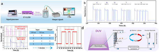 Given the exceptional PEC response performance and self-powered capabilities demonstrated by the TiO2–α-Ga2O3 material, we extended our research to explore its potential applications in the domain of safe optical communication. We developed an innovative system utilizing a PEC-PD as a self-powered optical signal receiver. This system is integrated with a programmable digital power supply for the optical signal generator and a 254 nm UV LED lamp, creating a highly efficient and stable communication platform, as depicted in Figure S2. Figure 5a illustrates the schematic of the measurement system. It demonstrates the transmission of international Morse code using the PEC-PD [61]. In Morse code, each letter is represented by a series of dots and dashes, as shown in Figure S3. Initially, we used a programmable digital power supply to precisely control the voltage output amplitude and duration, thereby finely tuning the brightness and duration of the UV signals. This allowed us to encode the information sequences “CNU” and “70” into Morse code patterns of dots and dashes. These UV signals were then wirelessly transmitted in open space and detected by the TiO2–α-Ga2O3 PD, which further converted into electrical signals, as depicted in Figure 5b. The electrical signal waveform displayed a sequence of three communication states: dot, dash, and silence. By decoding these sequences according to Morse code, we were able to accurately decipher the letters “CNU” and the digits “70”. Furthermore, the photodetector exhibited good stability and high responsiveness throughout the process. These findings conclusively demonstrate the feasibility and reliability of TiO2–α-Ga2O3 PD in constructing high-speed, low-power, and interference-resistant UV light communication systems.