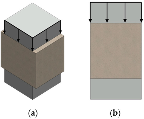 Scheme showing the compressive strength test: (a) three-dimensional image; (b) cross-section.