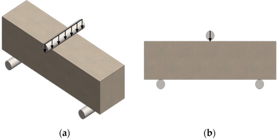 Flexural strength tests were carried out using a Matest 3000 kN testing machine on 40 × 40 × 160 mm specimens, based on EN 12390-5:2019-08 [40]. The linear speed of the force increase was 0.5 MPa/sec, with distances between supports of 150 mm (Figure 3). The result was estimated from three measurement repetitions for each material variant.