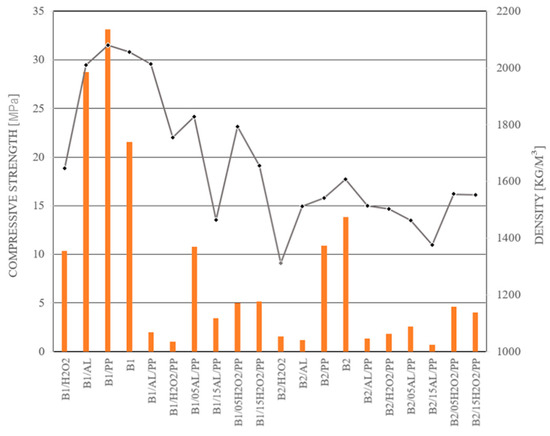 The analysis of the literature indicates that the addition of foaming agents, such as aluminum powder and H2O2, significantly impacts cohesion and workability. The results obtained from observing the mixture flow through the Abrams cone and the concrete flow during testing reveal that, with minor exceptions (B1/05H2O2/PP and B1/15H2O2/PP), concrete foams initially exhibit lower consistency. Subsequently, their structure becomes significantly denser, and they demonstrate slower material spreading during tests, corroborating the findings of other researchers [51]. Furthermore, the comparative analysis of the mixtures in this study confirms that the addition of fibers in the tested materials increases water absorption [52]. The strength-to-density ratio of the tested samples is not always straightforward; higher material density does not consistently correlate with increased compressive or bending strength. An exemplary case is sample B1/H2O2, which, despite its low density, demonstrates the highest compressive and bending strength. Conversely, B1/H2O2/P and B1/AL/PP samples, which exhibit the highest density, do not achieve the highest strength values. The influence of additives on strength properties is substantial. Figure 8 and Figure 9 illustrate the correlation between the mixture’s density and its corresponding bending and compressive strengths.
