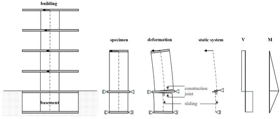 Shear walls clamped into the basement are not found in the literature. A test set-up was developed to analyse such walls, which consist of both a cantilevered part and a clamped part. In a separate publication [18], the walls are analysed due to flexure and interaction with shear (tension shift effect). Figure 1, on the right, shows—schematically—an example building. The basement wall must transfer the bending moment within a short distance into the basement box, resulting in a high shear force in the basement wall. At the construction joint below the basement ceiling, both the shear force and the bending moment are high. From flexure, a crack opens in the range where the steel yields and afterwards, under reverse loading, the crack closes again; however, not completely. This reduces the aggregate interlock resistance of the concrete decisively, which makes up the main part of the sliding shear resistance [16,17]. The steel’s dowel action resistance in the tension zone plays only a minor role. The steel is already in the plastic range due to flexure and has no further resistance capacity. In three large-scale tests with a scale of 1:1.5 compared to the real size, the interaction of the cantilevered and clamping wall sections is examined. In particular, the sliding shear behaviour in the construction joint between the basement wall and the basement ceiling is analysed. Figure 1 (middle and right) shows the test specimen schematically, the deformations and the cutting forces. As the deformed specimen in the middle shows, the sliding shear displacement moves in the same direction as the top displacement. This is according to the theory and was also seen in the experiments.