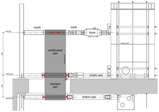 The test facility is shown in Figure 2. The figure shows the shear wall, the strong floor, the reaction walls below and above the strong floor and the clamping equipment on the force, middle and bottom axis. Forces are applied via the hydraulic cylinder. On the middle and bottom axis, the wall is clamped and connected to the horizontal supports. The clamping is achieved via prestressed rods. Five of six horizontal supports on the south and north sides of the wall are freely movable in the vertical direction. On the north side of the middle axis, the vertical support is located, achieved by a steel hinge. Thus, each axis can freely rotate without any constraint for a free deformation behaviour of the walls.