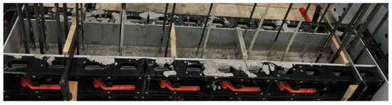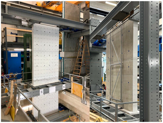 In Table 1, the geometry and reinforcement ratios are summarized for all the walls. The height hbase is defined as the distance between the support axis in the middle and at the bottom. The height hup is the distance between the upper load axis and the middle support axis. The axes are shown in Figure 2. Table 2 lists the material properties of the concrete; Table 3 lists the material properties of the steel. The walls were fabricated in four stages along the vertical axis. The concrete properties are given for Section 1 and Section 3, which correspond to the concrete in the basement wall and the cantilever wall part adjacent to the ceiling cutout. The mean value derives from at least five material tests. The compression strength of the concrete was measured on cubes with an edge length of 150 mm. As a basis of the concrete tensile strength, the splitting tensile strength was measured on cylinders with a length of 300 mm and a diameter of 150 mm. The material properties of the reinforcement bars are obtained from the bilinear approximations of the stress–strain relationships measured in the tension tests.