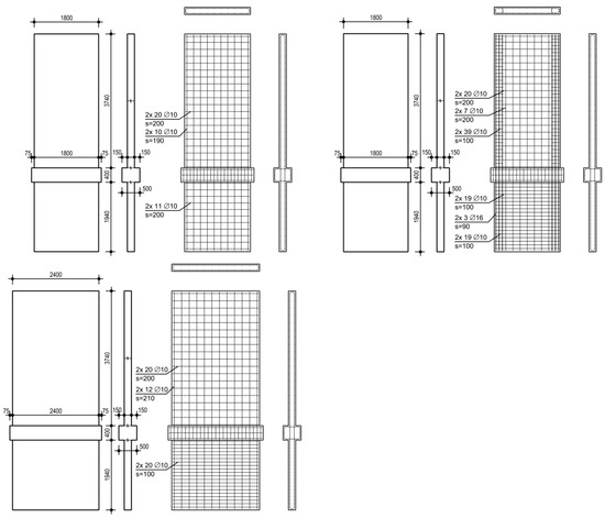 The investigation comprises three clamped shear walls; the reinforcement ratio and aspect ratio are varied. The walls are sufficiently designed against shear forces to focus on the interaction between bending and sliding shear. They consist of cantilevered and clamped parts, between which the ceiling cutout is located. The thickness of the cutout is 500 mm, and the height is 400 mm. Vertical reinforcement is continuous over the total height without lap splicing. The idea is to focus on pure sliding shear failure and avoid the influence of additional effects. An overview of the geometry and reinforcement ratios of all the walls can be found in Table 1. The walls are specified subsequently. The formwork and reinforcement plans are given in Figure 4.