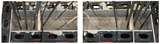 Figure 5 shows the construction joint between the basement wall and the basement ceiling. The concrete was compacted with a vibrating bottle and not further roughened, as is often performed in practice. The largest grain size of the concrete is 16 mm. As the picture shows, the roughness is not pronounced. The height differences across the joint are in the range of up to 4 mm.