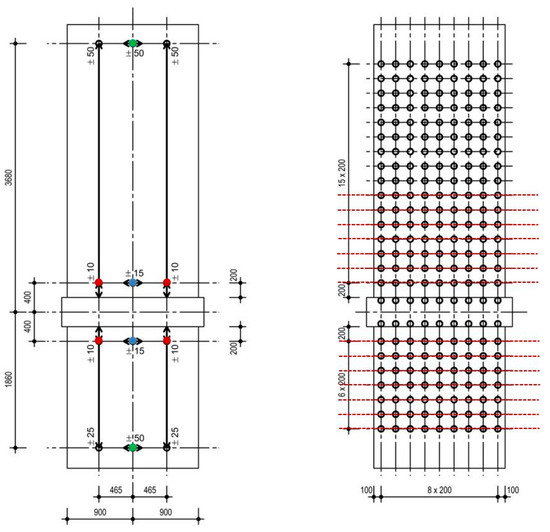 Measurement points of the displacement transducers (left): green for the top and bottom displacements, blue for the sliding shear displacements and red for the relative Y-displacements around the construction joints; reflector grid of the optical measurement (right); dimensions are in mm; example NW 1.